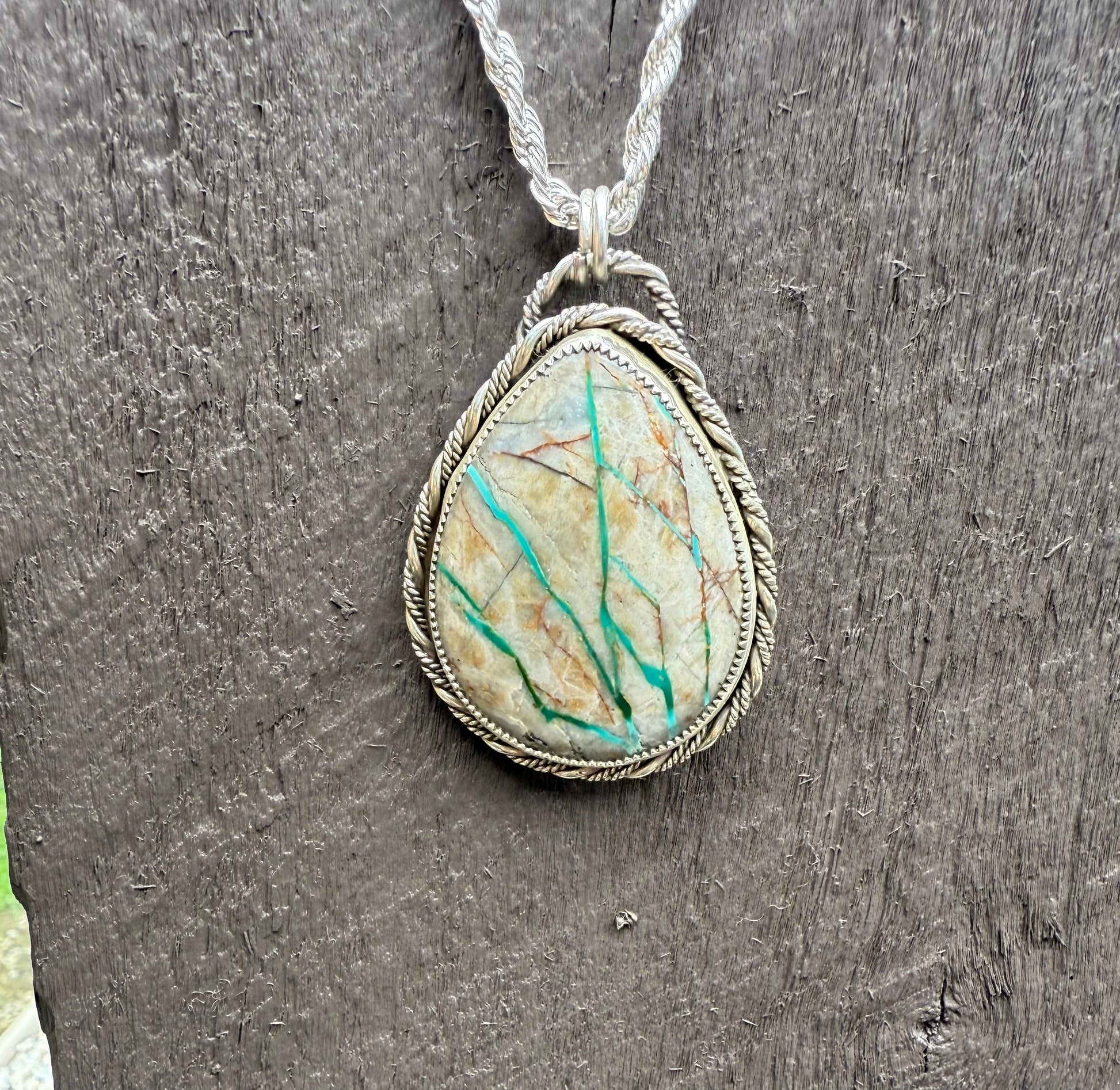 90 carats of very rare royston ribbon turquoise with tons of turquoise veins running through it. Set in sterling silver with a solid sterling silver back, with sterling rope accent as well. This is a one-of-a-kind item with a VERY high quality and rare stone, handmade by me