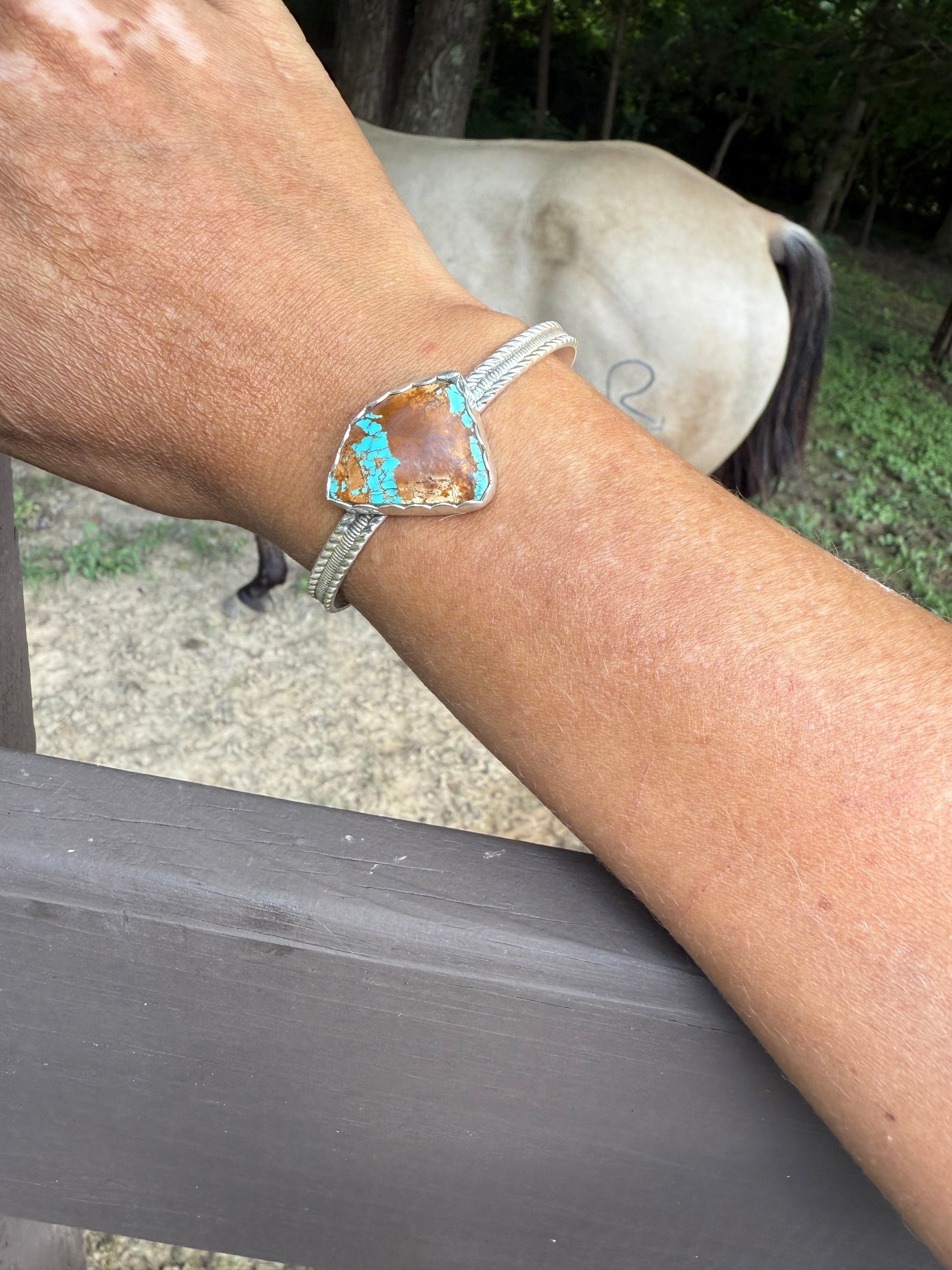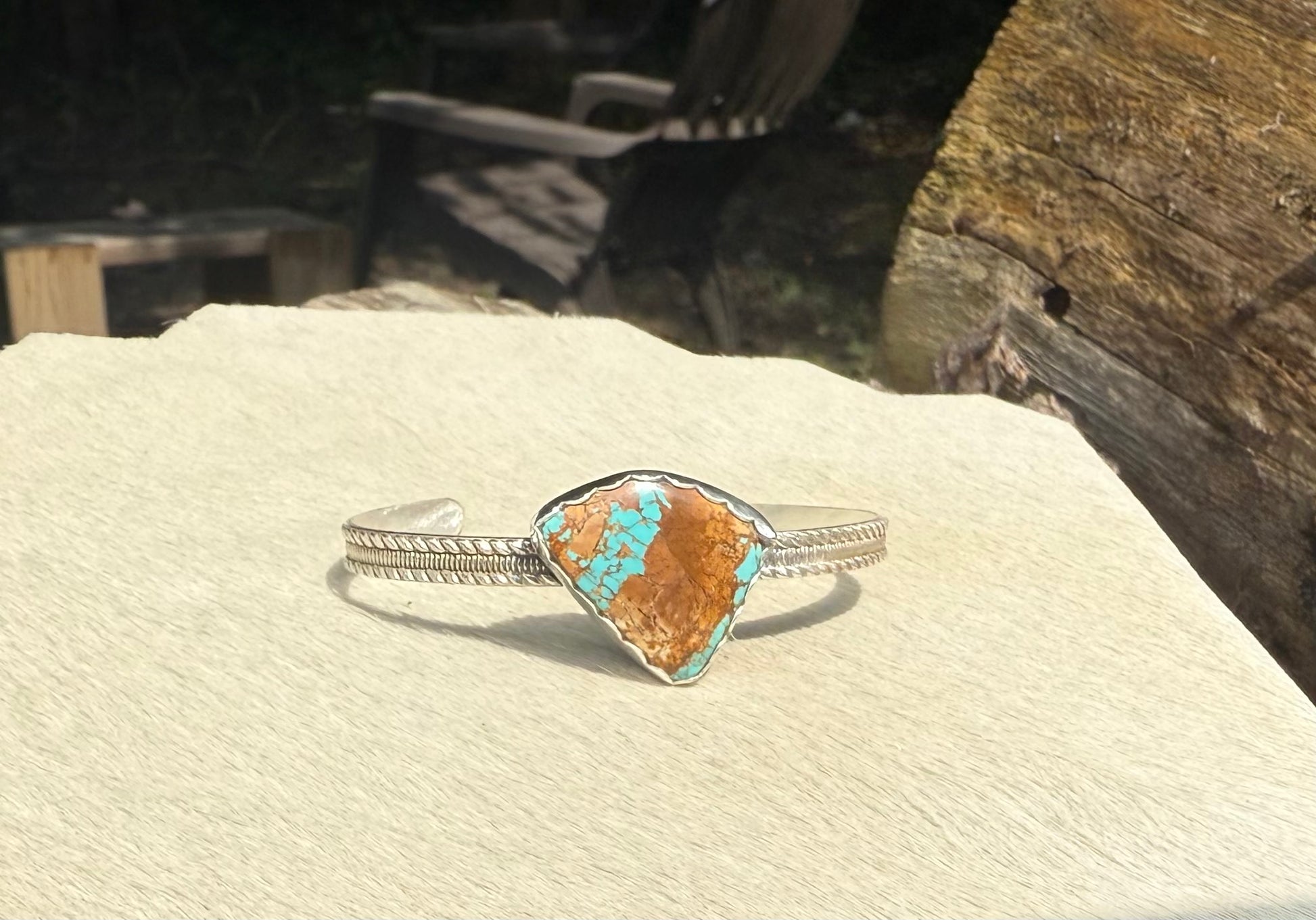 Genuine turquoise and sterling silver. Adjustable cuff, best for small to medium wrists 5.75”