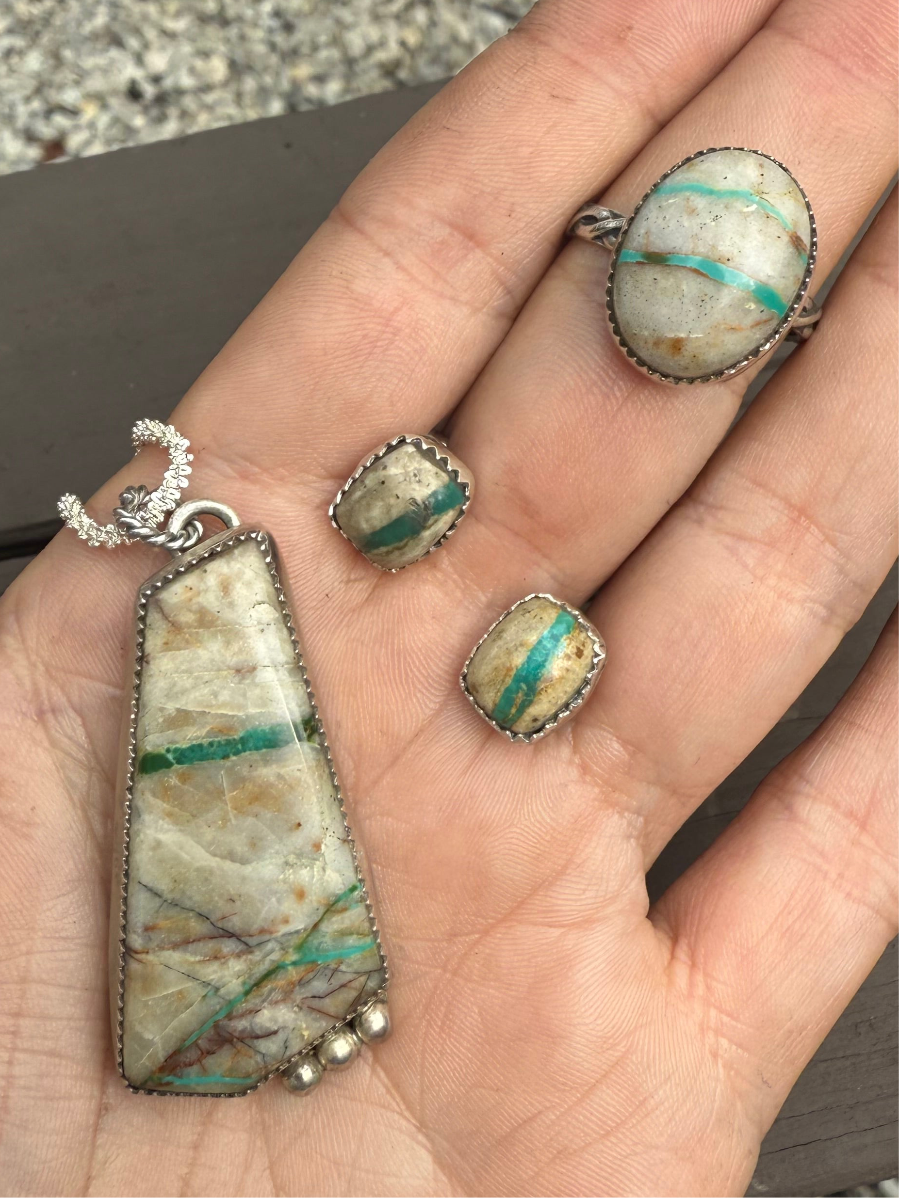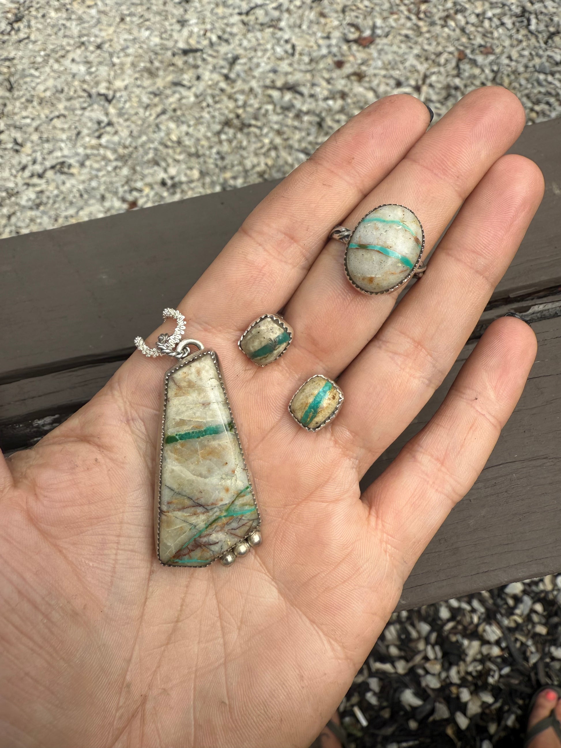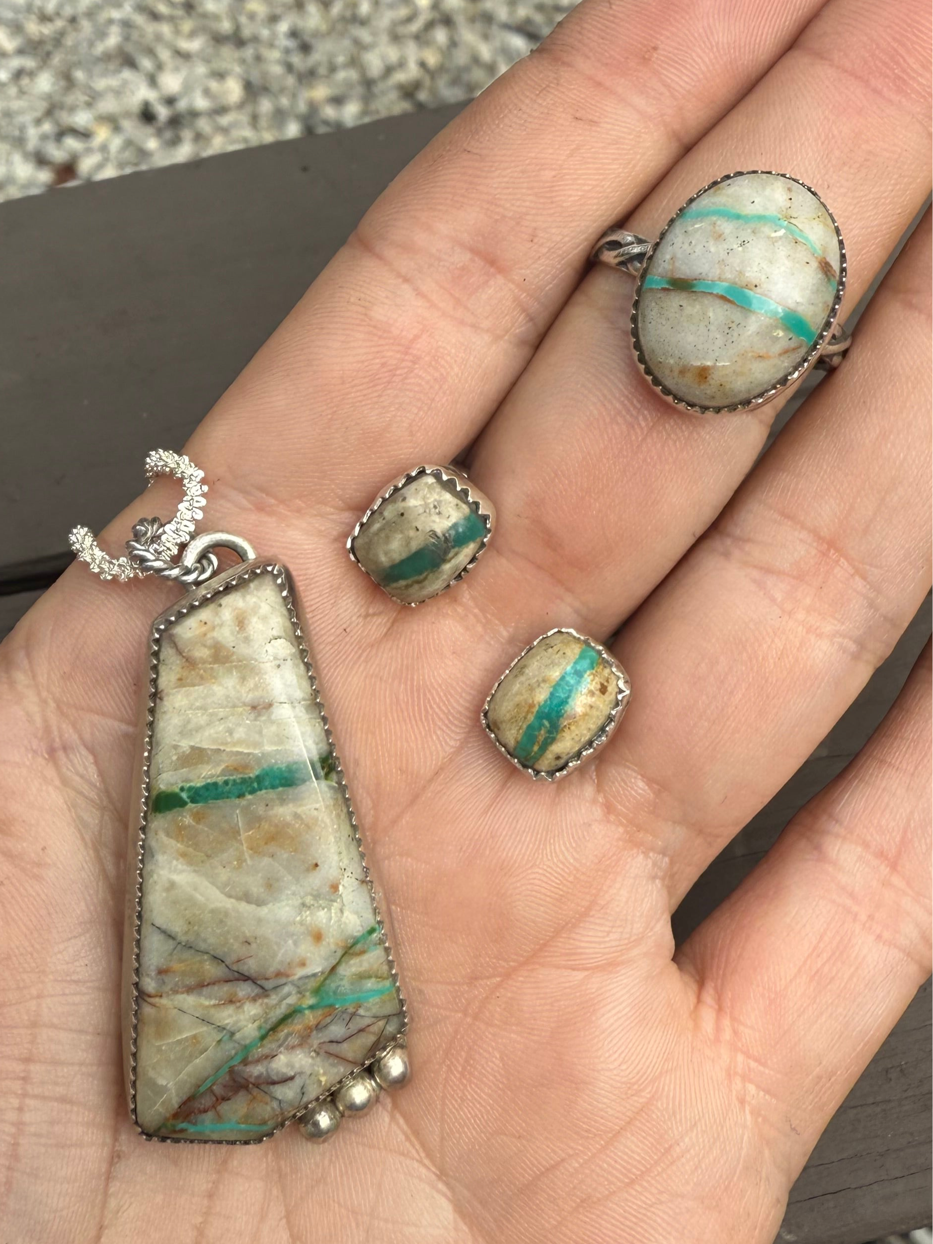 Necklace, studs, and adjustable ring all sterling silver and handmade by me
