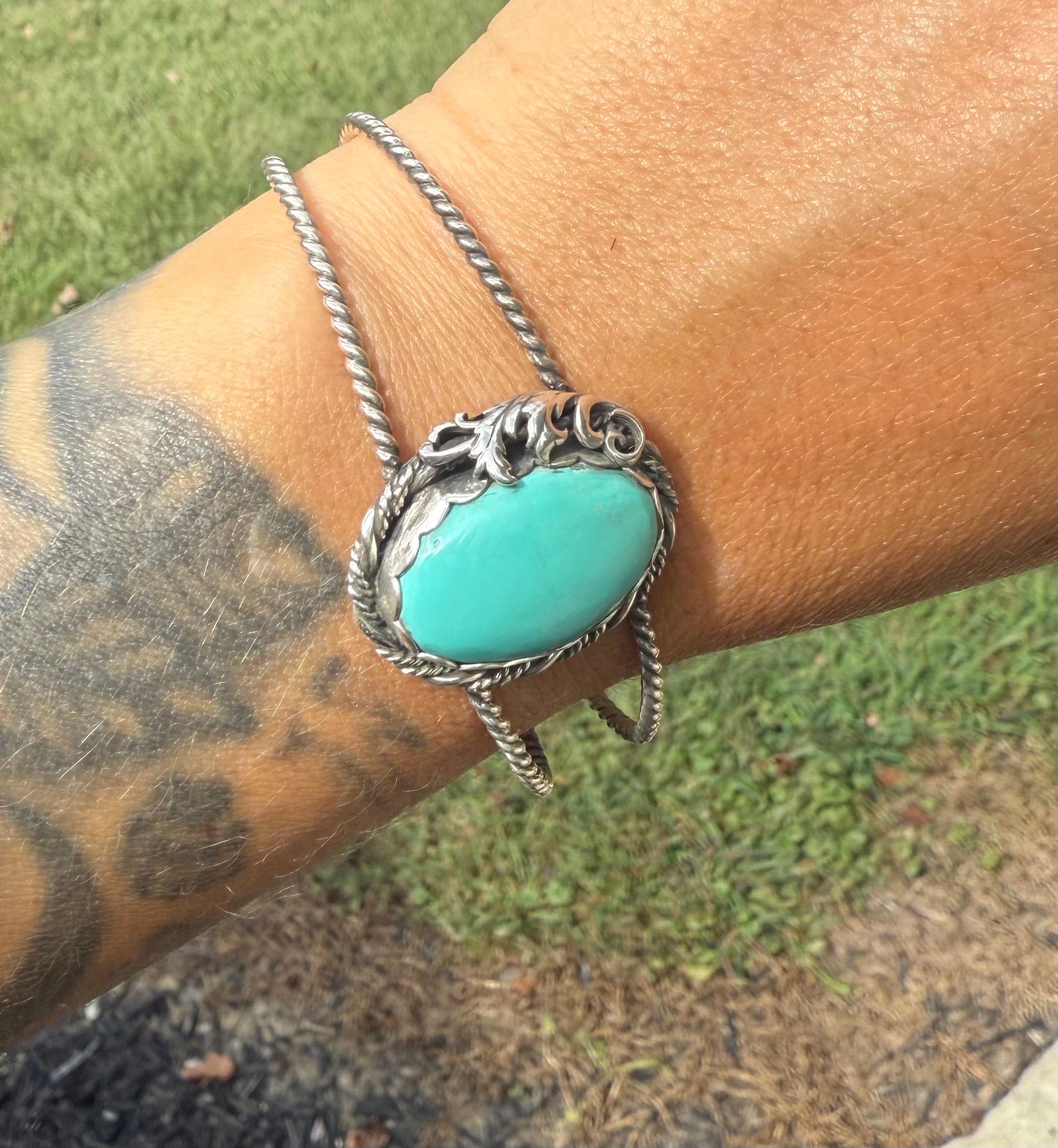 Sterling silver, 6.5” adjustable, Royston turquoise, stamped and signed